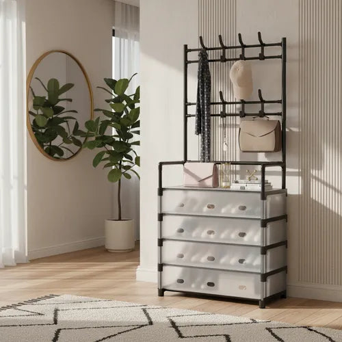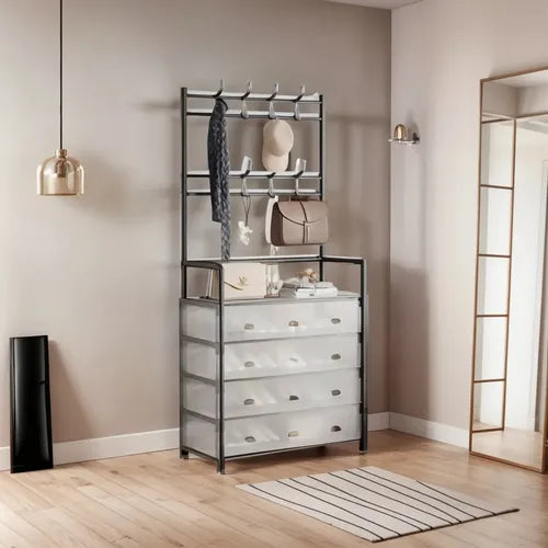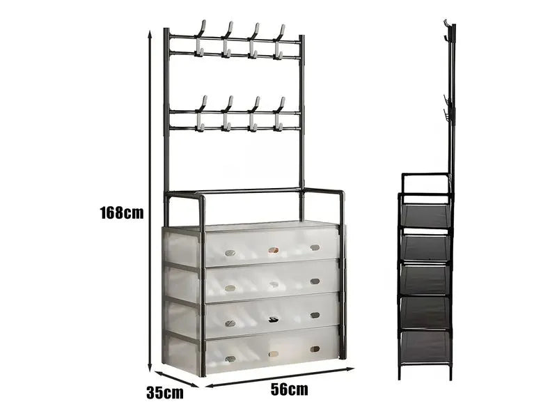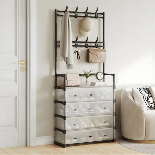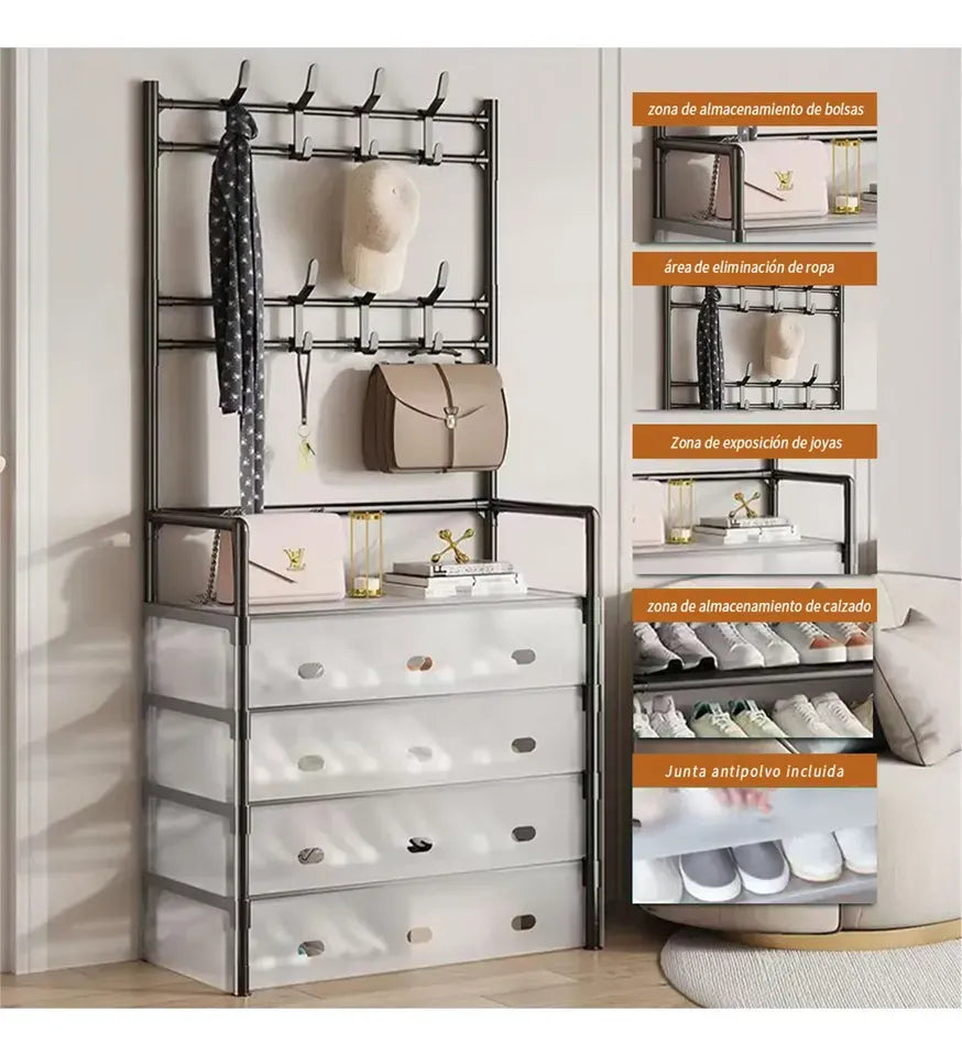 Organizador de calzado y accesorios con 5 niveles de almacenamiento más perchero integrado. Cuenta con puertas transparentes que permiten visualizar el contenido sin abrir, ideal para mantener tu espacio ordenado y optimizado. Estructura metálica resistente y duradera que facilita el montaje rápido sin complicaciones. Solución compacta perfecta para dormitorios, entradas o closets con espacio limitado.